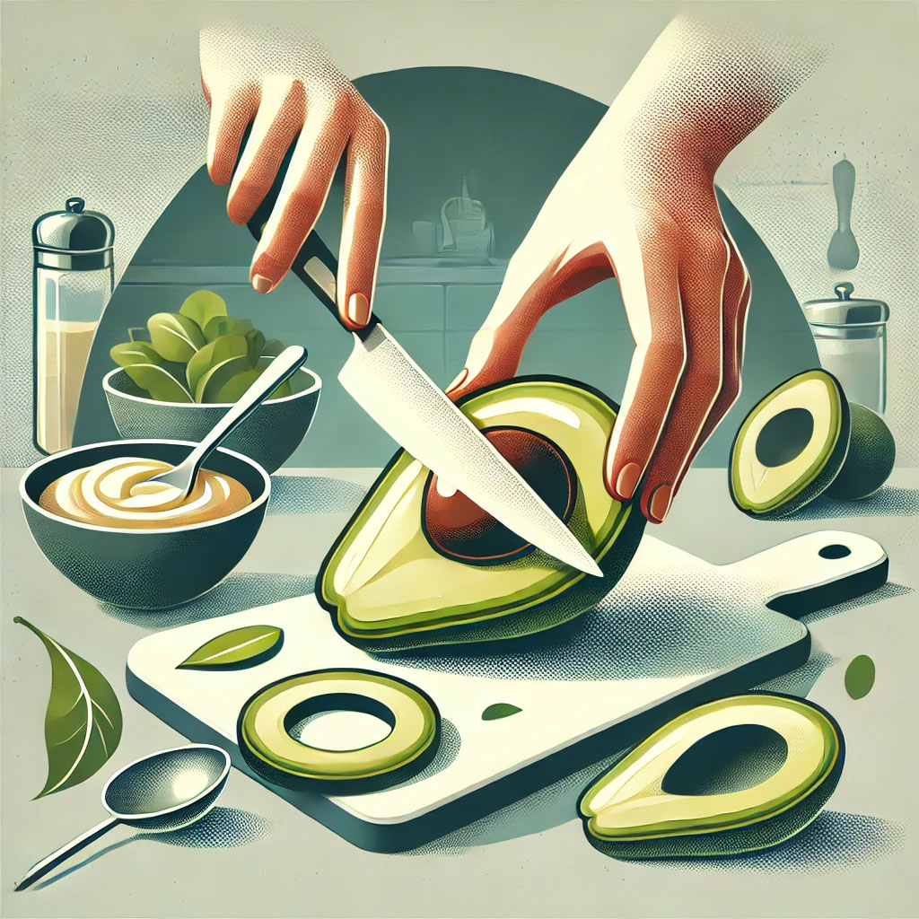 - 아보카도 반으로 자르기: 아보카도를 세로로 반으로 자른 후, 양손으로 비틀어 씨를 제거합니다.